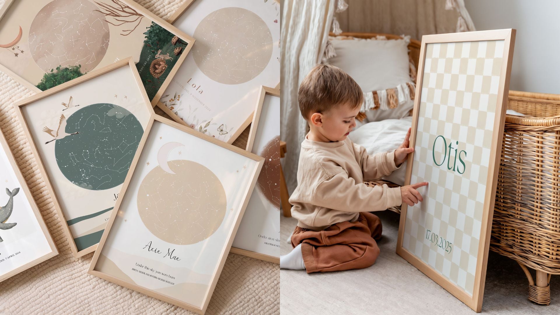 Ontdek onze sterrenhemel- en naamposters, uniek ontworpen voor jullie kindje. Stijlvolle muurkunst met een persoonlijk tintje.