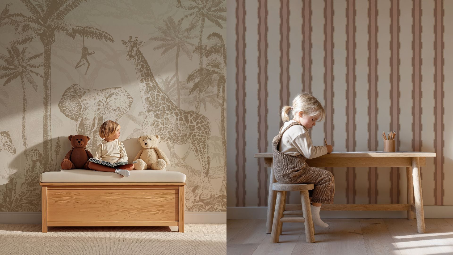 Ons patroonbehang voor de kinderkamer brengt rust en sfeer met ontwerpen van bloemen, manen, grafische vormen en ruimte-motieven.