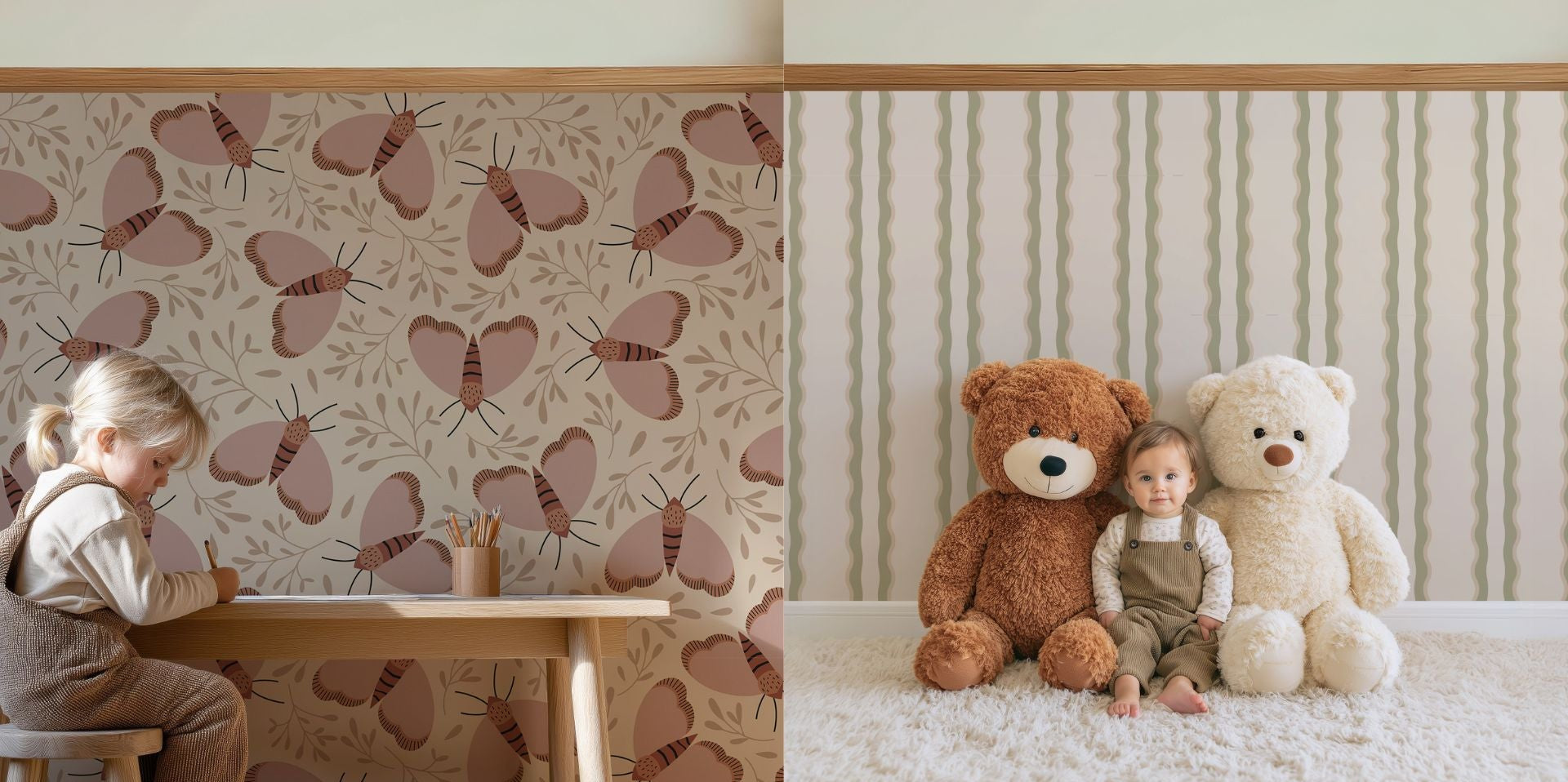 Breng sfeer aan de muur met onze favoriete patronen voor lambrisering. Tijdloos, stijlvol en met zorg ontworpen voor de kinderkamer.