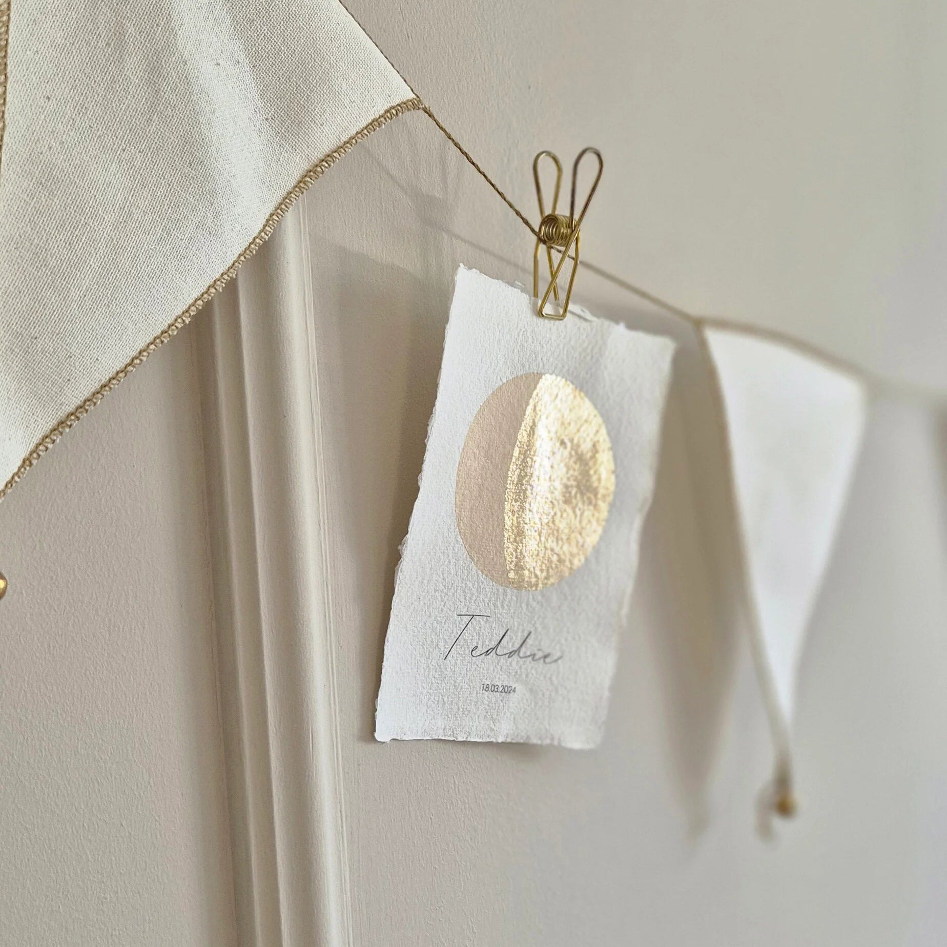 Gedrukt op handgeschept Khadi-papier en met de hand bewerkt met acrylverf en bladmetaal. Elke maanstand, letter of datum wordt met liefde tot leven gebracht. Uniek, persoonlijk en met gevoel voor detail.