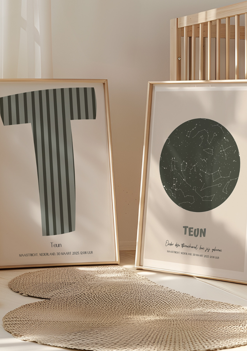 De posters in dit moodboard zorgen voor balans tussen speels en stoer. Grafische vormen, rustige lijnen en diepe kleuren maken de kamer net wat volwassener, terwijl ze perfect passen bij de vrolijke basis. Door prints te mixen binnen hetzelfde kleurenpalet ontstaat een fijne gallery wall die rust brengt en toch spannend blijft.