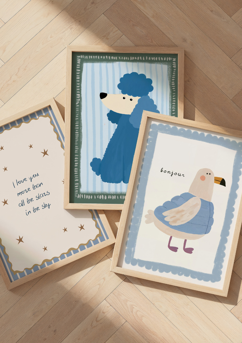 De posters brengen extra vrolijkheid in dit kamertje. Dierenillustraties en zachte kleuren zorgen voor een lieve, kinderlijke sfeer. Ze nodigen uit tot fantasie en maken de kamer persoonlijk en speels. Door posters te mixen in dezelfde kleuren ontstaat er een gezellige gallery wall die rustig blijft. Vandaag samen aan de muur, morgen misschien weer net even anders. Dat maakt het extra leuk.
